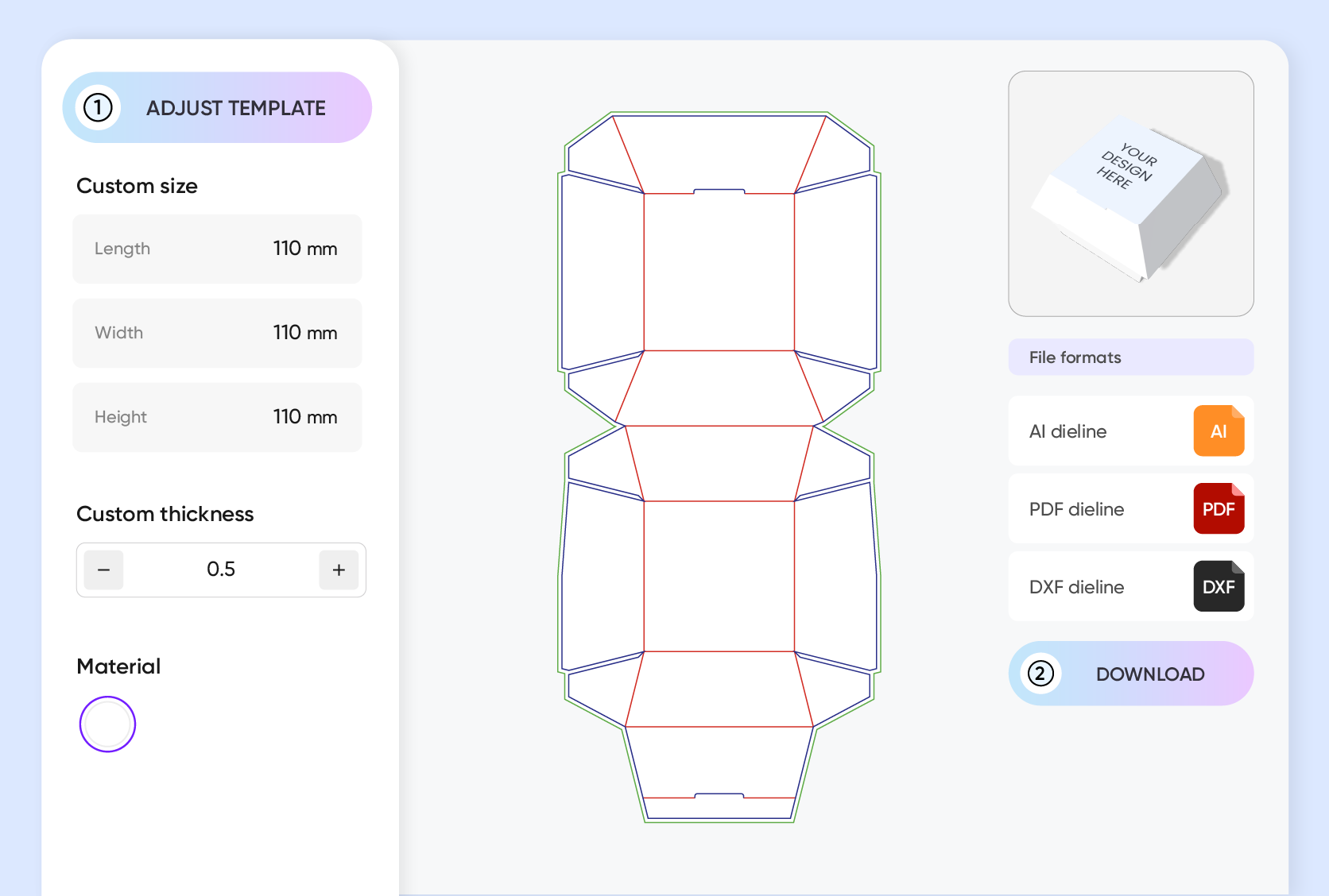 You can make your candy box on Pacdora with a few steps. First, choose your preferred template. Then, adjust the size, thickness, and material. Finally, export your candy box template in DXF, PDF, and AI formats.